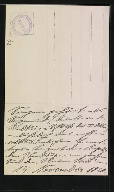 Personenbezogene Daten auf der Rückseite der Karte wurden durch blauen Textmarker unkenntlich gemacht. Die blauen Stellen sind auf die Vorderseite durchgeweicht und wirken sich negativ auf das Postkartenfoto aus