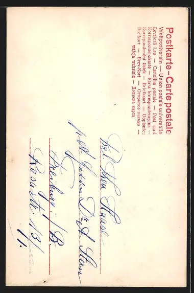 Personenbezogene Daten auf der Rückseite der Karte wurden durch blauen Textmarker unkenntlich gemacht. Die blauen Stellen sind auf die Vorderseite durchgeweicht und wirken sich negativ auf das Postkartenfoto aus