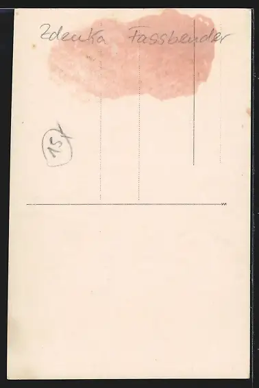 Personenbezogene Daten auf der Rückseite der Karte wurden durch blauen Textmarker unkenntlich gemacht. Die blauen Stellen sind auf die Vorderseite durchgeweicht und wirken sich negativ auf das Postkartenfoto aus