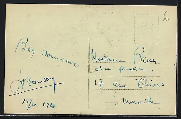 Personenbezogene Daten auf der Rückseite der Karte wurden durch blauen Textmarker unkenntlich gemacht. Die blauen Stellen sind auf die Vorderseite durchgeweicht und wirken sich negativ auf das Postkartenfoto aus