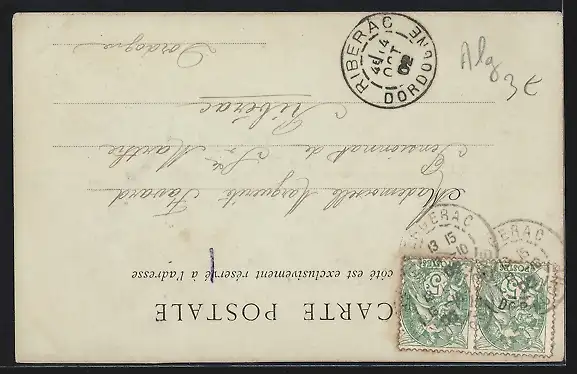 Personenbezogene Daten auf der Rückseite der Karte wurden durch blauen Textmarker unkenntlich gemacht. Die blauen Stellen sind auf die Vorderseite durchgeweicht und wirken sich negativ auf das Postkartenfoto aus
