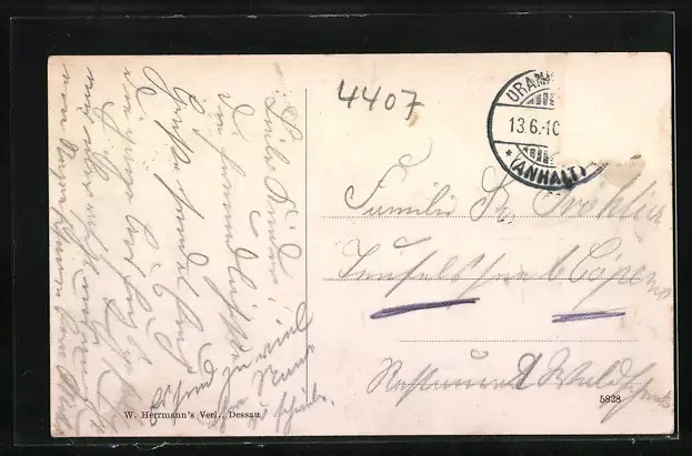 alte Ansichtskarte, gelaufen 1910, Briefmarke entfernt, rückseitig Oberflächenschaden, guter Zustand