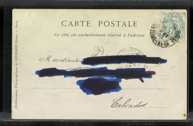Personenbezogene Daten auf der Rückseite der Karte wurden durch blauen Textmarker unkenntlich gemacht. Die blauen Stellen sind auf die Vorderseite durchgeweicht und wirken sich negativ auf das Postkartenfoto aus