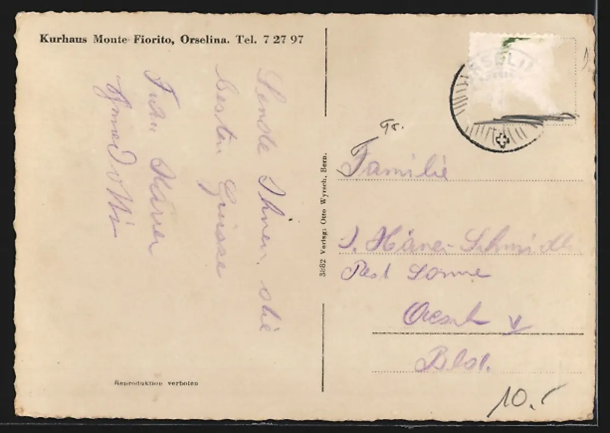 Personenbezogene Daten auf der Rückseite der Karte wurden durch blauen Textmarker unkenntlich gemacht. Die blauen Stellen sind auf die Vorderseite durchgeweicht und wirken sich negativ auf das Postkartenfoto aus