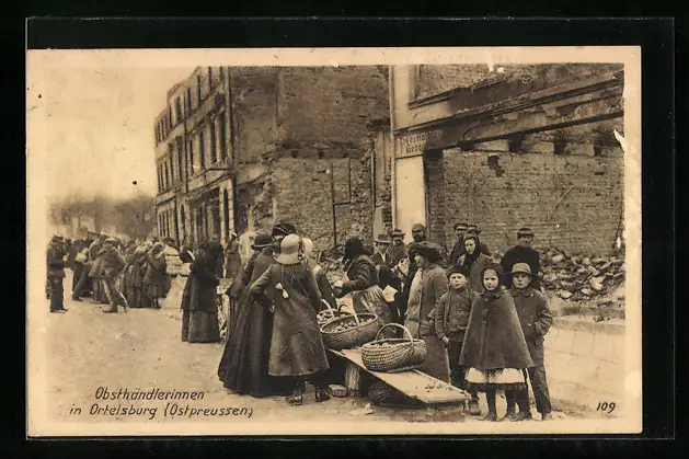 AK Ortelsburg, Kinder bei den Obsthändlerinnen in einer Strasse