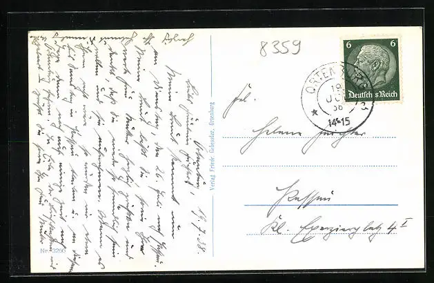 Personenbezogene Daten auf der Rückseite der Karte wurden durch blauen Textmarker unkenntlich gemacht. Die blauen Stellen sind auf die Vorderseite durchgeweicht und wirken sich negativ auf das Postkartenfoto aus