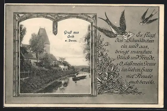 AK Orth a. d. Donau, Flusspartie mit einem Stocherkahn