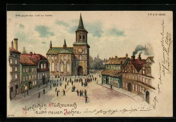 AK Ortspartie mit Rathaus, Halt gegen das Licht, Neujahrsgruss