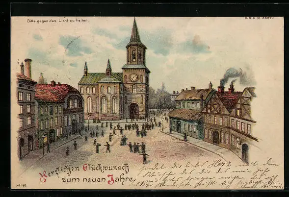 AK Ortspartie mit Rathaus, Halt gegen das Licht, Neujahrsgruss
