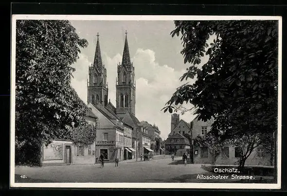 AK Oschatz, Altoschatzer Strasse mit Kirche