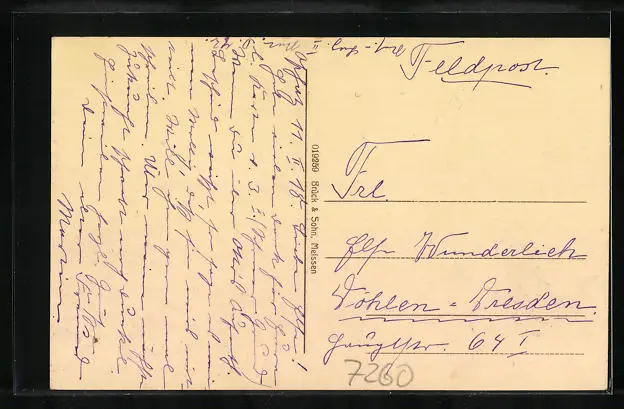 Personenbezogene Daten auf der Rückseite der Karte wurden durch blauen Textmarker unkenntlich gemacht. Die blauen Stellen sind auf die Vorderseite durchgeweicht und wirken sich negativ auf das Postkartenfoto aus