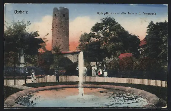 AK Oschatz, Springbrunnen u. alter Turm an der Promenade