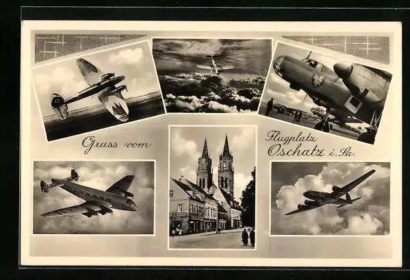 AK Oschatz i. Sa., Flugplatz mit Zivil- und Militärflugzeugen