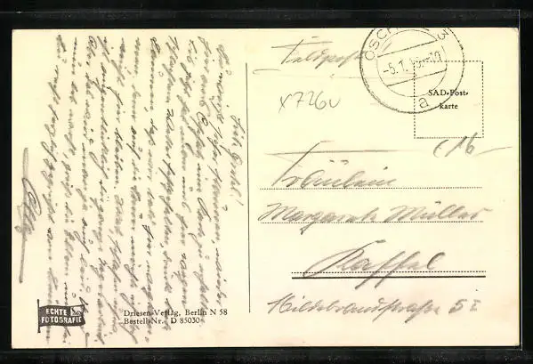 Personenbezogene Daten auf der Rückseite der Karte wurden durch blauen Textmarker unkenntlich gemacht. Die blauen Stellen sind auf die Vorderseite durchgeweicht und wirken sich negativ auf das Postkartenfoto aus