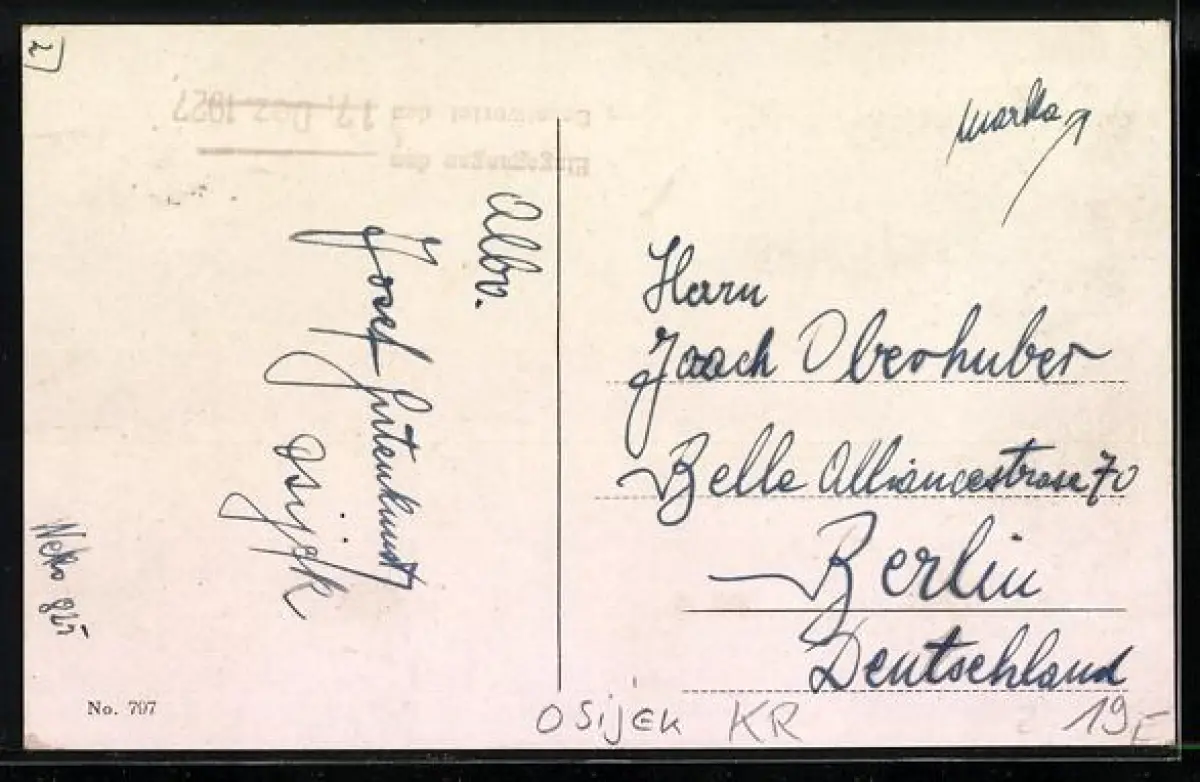 Personenbezogene Daten auf der Rückseite der Karte wurden durch blauen Textmarker unkenntlich gemacht. Die blauen Stellen sind auf die Vorderseite durchgeweicht und wirken sich negativ auf das Postkartenfoto aus