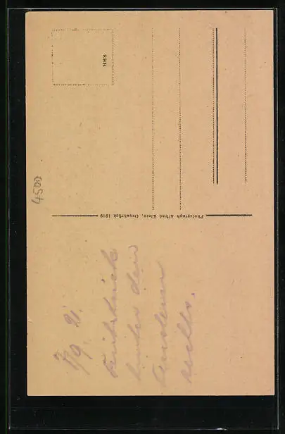 Personenbezogene Daten auf der Rückseite der Karte wurden durch blauen Textmarker unkenntlich gemacht. Die blauen Stellen sind auf die Vorderseite durchgeweicht und wirken sich negativ auf das Postkartenfoto aus
