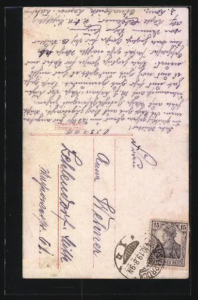 Personenbezogene Daten auf der Rückseite der Karte wurden durch blauen Textmarker unkenntlich gemacht. Die blauen Stellen sind auf die Vorderseite durchgeweicht und wirken sich negativ auf das Postkartenfoto aus
