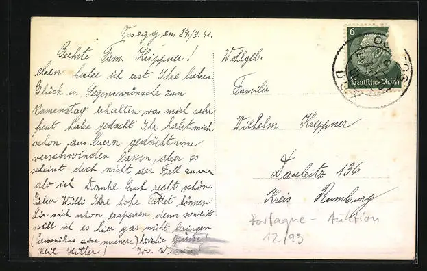 alte Ansichtskarte, gelaufen 1941, Briefmarke entfernt, guter Zustand