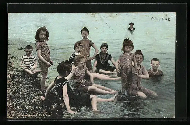 AK Ostende, Kinder am Strand in Bademode