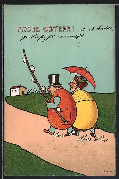 AK Osterei-Paar bei einem Spaziergang, Ostergruss