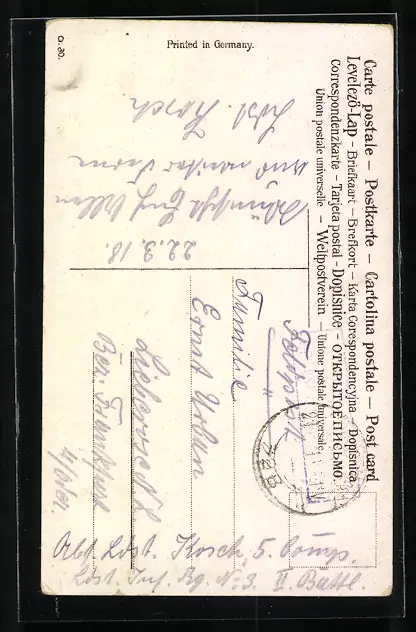 Personenbezogene Daten auf der Rückseite der Karte wurden durch blauen Textmarker unkenntlich gemacht. Die blauen Stellen sind auf die Vorderseite durchgeweicht und wirken sich negativ auf das Postkartenfoto aus