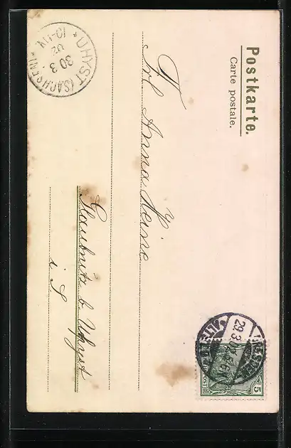Personenbezogene Daten auf der Rückseite der Karte wurden durch blauen Textmarker unkenntlich gemacht. Die blauen Stellen sind auf die Vorderseite durchgeweicht und wirken sich negativ auf das Postkartenfoto aus