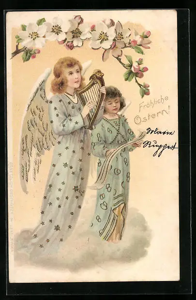 AK Osterengel beim Singen mit kleiner Harfe
