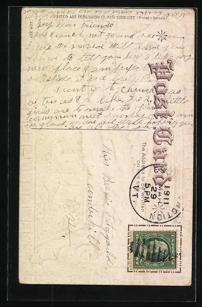 Personenbezogene Daten auf der Rückseite der Karte wurden durch blauen Textmarker unkenntlich gemacht. Die blauen Stellen sind auf die Vorderseite durchgeweicht und wirken sich negativ auf das Postkartenfoto aus
