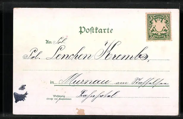 Personenbezogene Daten auf der Rückseite der Karte wurden durch blauen Textmarker unkenntlich gemacht. Die blauen Stellen sind auf die Vorderseite durchgeweicht und wirken sich negativ auf das Postkartenfoto aus