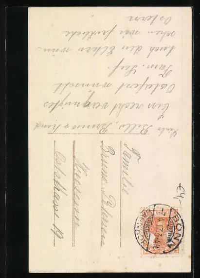 Personenbezogene Daten auf der Rückseite der Karte wurden durch blauen Textmarker unkenntlich gemacht. Die blauen Stellen sind auf die Vorderseite durchgeweicht und wirken sich negativ auf das Postkartenfoto aus