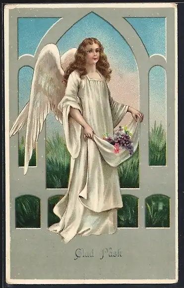 AK Osterengel mit Blumen vor einem Kirchenfenster, Glad Pask