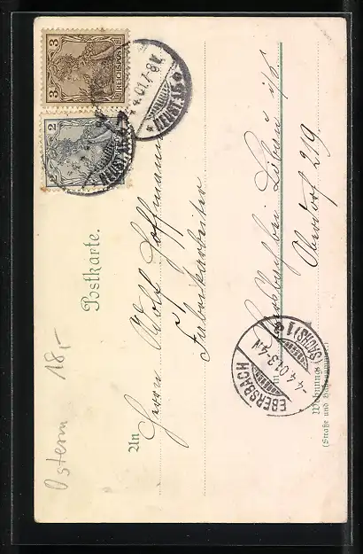 Personenbezogene Daten auf der Rückseite der Karte wurden durch blauen Textmarker unkenntlich gemacht. Die blauen Stellen sind auf die Vorderseite durchgeweicht und wirken sich negativ auf das Postkartenfoto aus