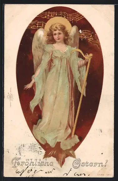 AK Osterengel mit Harfe, Fröhliche Ostern