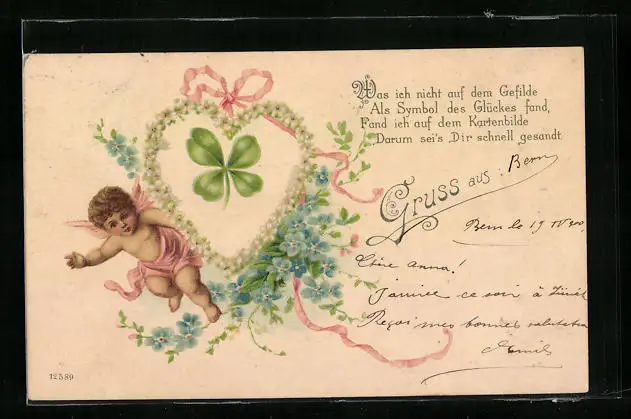 AK Osterengel mit Kleeblatt und Vergissmeinnicht