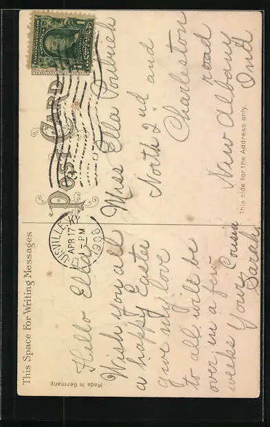 Personenbezogene Daten auf der Rückseite der Karte wurden durch blauen Textmarker unkenntlich gemacht. Die blauen Stellen sind auf die Vorderseite durchgeweicht und wirken sich negativ auf das Postkartenfoto aus