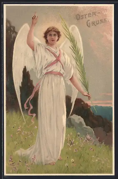 AK Osterengel mit Palmzweig auf einer blühenden Wiese