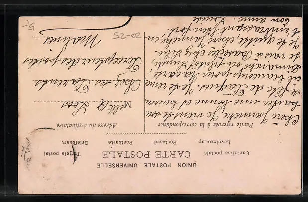Personenbezogene Daten auf der Rückseite der Karte wurden durch blauen Textmarker unkenntlich gemacht. Die blauen Stellen sind auf die Vorderseite durchgeweicht und wirken sich negativ auf das Postkartenfoto aus