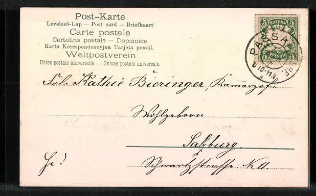 Personenbezogene Daten auf der Rückseite der Karte wurden durch blauen Textmarker unkenntlich gemacht. Die blauen Stellen sind auf die Vorderseite durchgeweicht und wirken sich negativ auf das Postkartenfoto aus