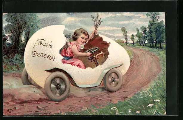 AK Ostergrüsse eines kleinen Mädchens in einem Automobil in Form eines Ostereis