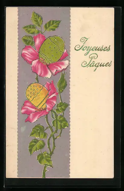 AK Ostergruss, Bühende Rose mit bunten Eiern