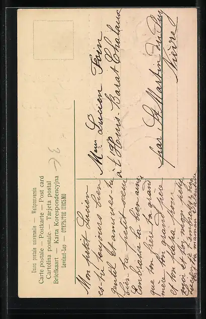 Personenbezogene Daten auf der Rückseite der Karte wurden durch blauen Textmarker unkenntlich gemacht. Die blauen Stellen sind auf die Vorderseite durchgeweicht und wirken sich negativ auf das Postkartenfoto aus