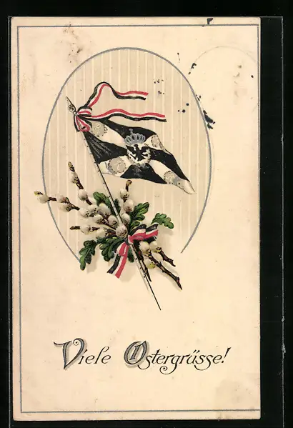 AK Ostergruss mit preussischer Fahne und Weidenkätzchen