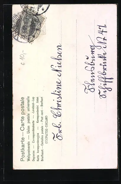 Personenbezogene Daten auf der Rückseite der Karte wurden durch blauen Textmarker unkenntlich gemacht. Die blauen Stellen sind auf die Vorderseite durchgeweicht und wirken sich negativ auf das Postkartenfoto aus