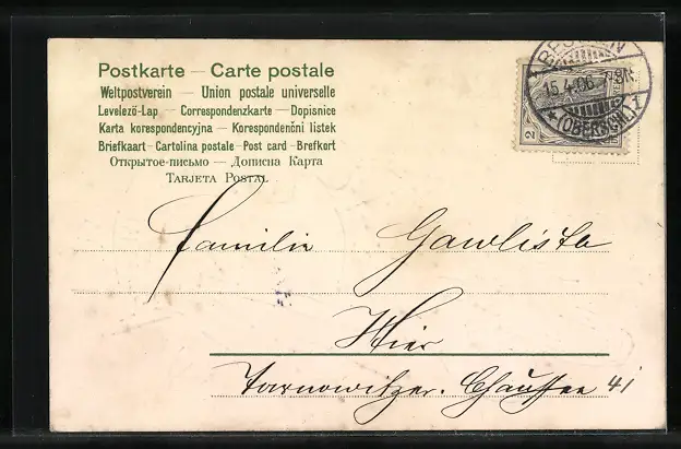 Personenbezogene Daten auf der Rückseite der Karte wurden durch blauen Textmarker unkenntlich gemacht. Die blauen Stellen sind auf die Vorderseite durchgeweicht und wirken sich negativ auf das Postkartenfoto aus