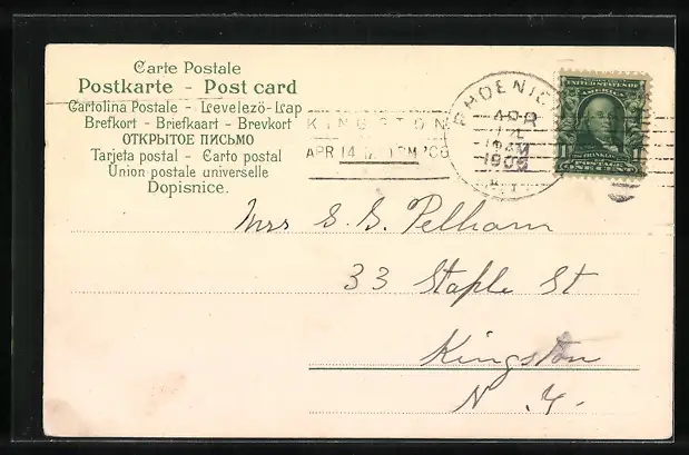 Personenbezogene Daten auf der Rückseite der Karte wurden durch blauen Textmarker unkenntlich gemacht. Die blauen Stellen sind auf die Vorderseite durchgeweicht und wirken sich negativ auf das Postkartenfoto aus