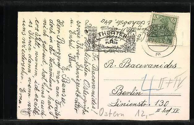 Personenbezogene Daten auf der Rückseite der Karte wurden durch blauen Textmarker unkenntlich gemacht. Die blauen Stellen sind auf die Vorderseite durchgeweicht und wirken sich negativ auf das Postkartenfoto aus
