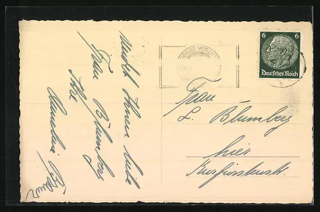Personenbezogene Daten auf der Rückseite der Karte wurden durch blauen Textmarker unkenntlich gemacht. Die blauen Stellen sind auf die Vorderseite durchgeweicht und wirken sich negativ auf das Postkartenfoto aus