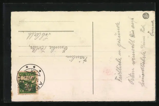 Personenbezogene Daten auf der Rückseite der Karte wurden durch blauen Textmarker unkenntlich gemacht. Die blauen Stellen sind auf die Vorderseite durchgeweicht und wirken sich negativ auf das Postkartenfoto aus