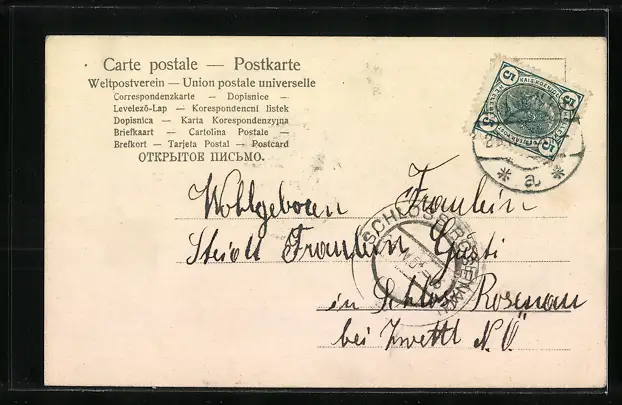 Personenbezogene Daten auf der Rückseite der Karte wurden durch blauen Textmarker unkenntlich gemacht. Die blauen Stellen sind auf die Vorderseite durchgeweicht und wirken sich negativ auf das Postkartenfoto aus