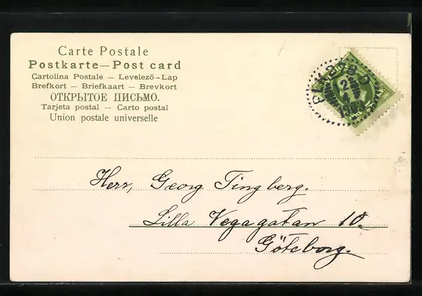 Personenbezogene Daten auf der Rückseite der Karte wurden durch blauen Textmarker unkenntlich gemacht. Die blauen Stellen sind auf die Vorderseite durchgeweicht und wirken sich negativ auf das Postkartenfoto aus